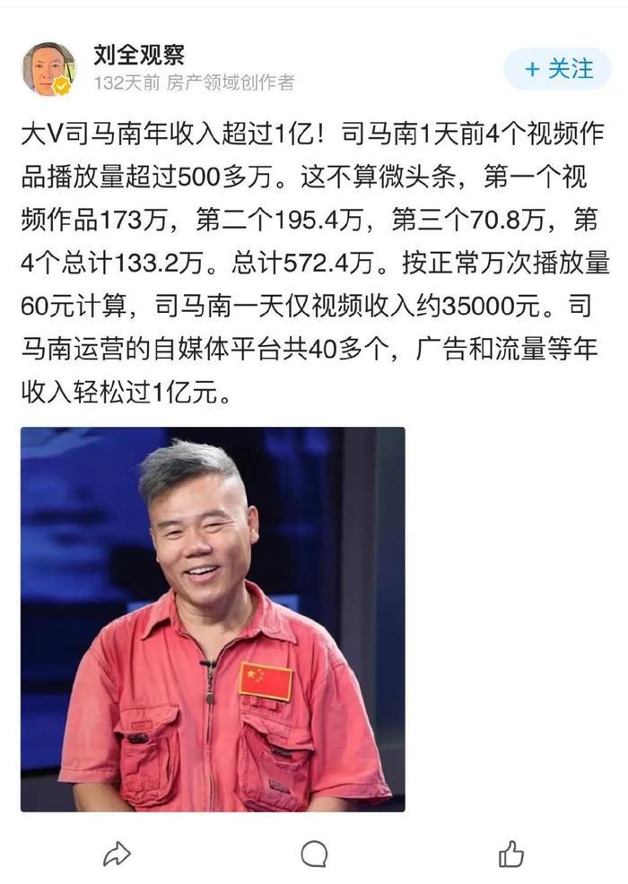 照此推算,10倍于李肃的司马南,年收入或可高达1亿!这也印证了一业内人士——刘全观察早在数月之前对司马南收入的预测。