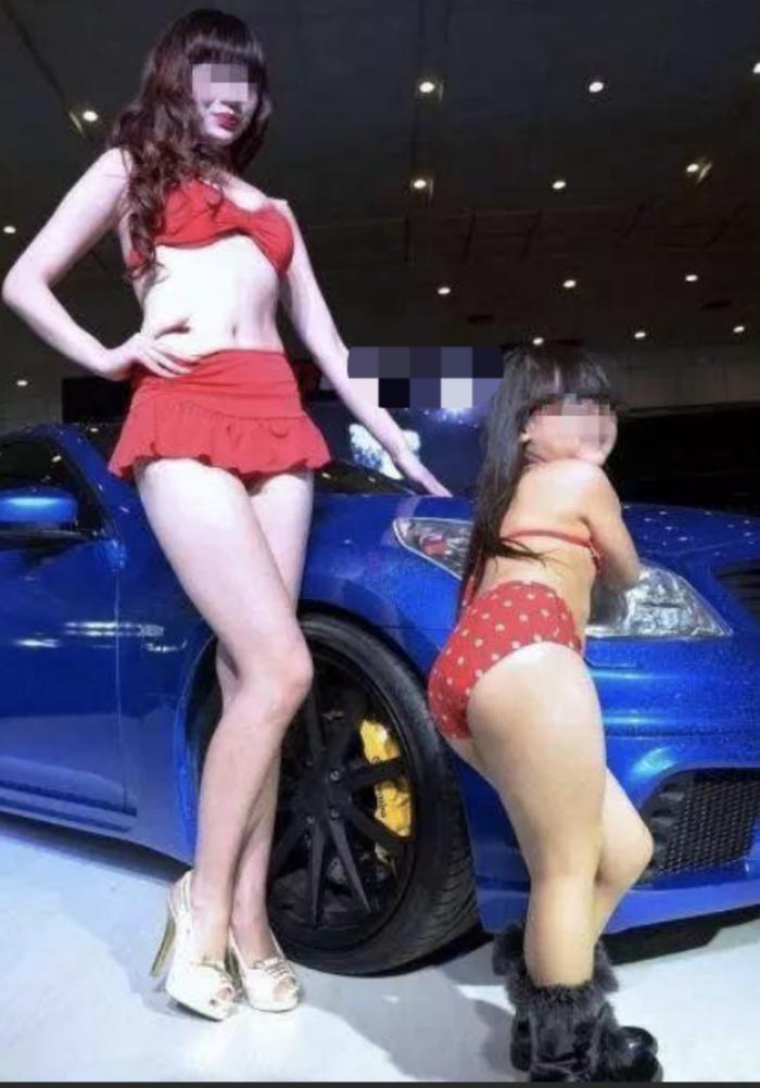 某车展上,娇小的女童化着艳妆,穿着比基尼,学着成人车模做着动作,尽显妩媚。