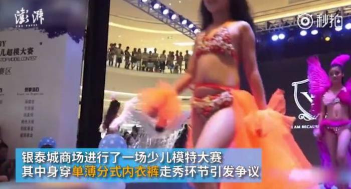 T台上,一群不足10岁的儿童,穿着暴露的性感内衣,模仿着性感尤物扭胯、迈猫步,堪称儿童版维密秀。
