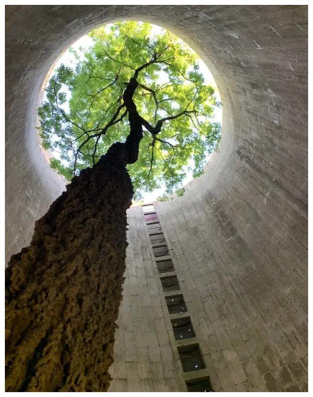 废弃筒仓里的一棵参天大树,太美了!