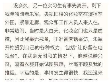 她称有一天单独在化妆师陪着朱军,正准备工作,朱军忽然行为有些异常: