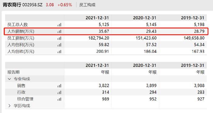 青农商行虽说是一家中规模的商业银行,人均薪酬并不比国有大行差。2021年人均薪酬35.67万元,比2020年增加6万多元。比如工行,去年人均薪酬32万元。而作为董事长,刘仲生去年薪酬157万元,减少12万多元,依然是最高薪。他还持有59万股股票。