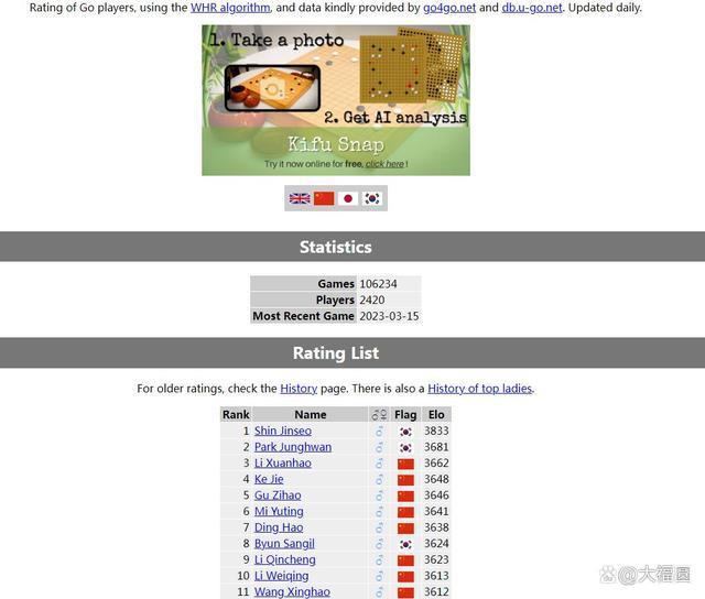 世界知名的职业围棋排名网站Goratings,日前推出了最新的世界职业棋手排行榜。我们欣喜地发现,王星昊八段以3612分排名第11位。