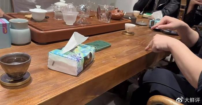 马蓉在和朋友一起聚餐时,身边也同样坐了一位男士,从她的视角来看,该男子身着黑色裤子正在旁边不停地比划着什么,与她相当熟捻。