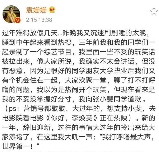 三年前,张小斐还算是三线小明星时,她和同学袁姗姗参加了某综艺节目。不知是节目组刻意安排,还是袁姗姗想让张小斐出丑,她在节目中说张小斐睡觉打呼噜。就算是张小斐否认后,袁姗姗还得专门跑到微博上继续聊这个话题。