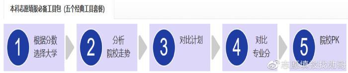 志愿填报,先要学会根据分数选大学,有了目标院校之后,就要细致分析这所大学的走势,分析走势时要结合学校的专业录取分和招生计划来进行分析。(如下图所示的志愿填报的5个步骤)