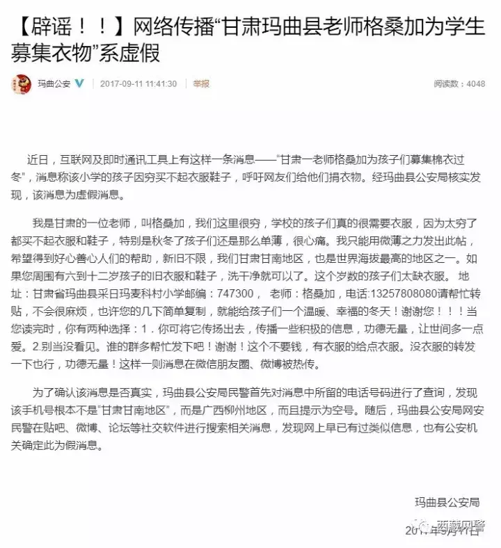 4、甘肃省甘南州玛曲县公安局官方微博@玛曲公安 已于9月11日发布了《【辟谣!!】网络传播“甘肃玛曲县老师格桑加为学生募集衣物”系虚假》的辟谣信息。