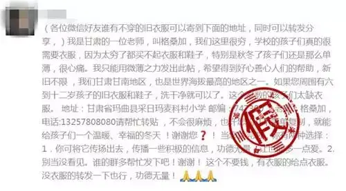 这则消息以一名老师的口吻称:“我是甘肃的一位老师,叫格桑加,我们这里很穷,学校的孩子们真的很需要衣服……我只能用微薄之力发出此帖,希望得到好心人们的帮助,新旧不限。如果您周围有六到十二岁孩子的旧衣服和鞋子,洗干净就可以了。地址:甘肃省玛曲县采日玛麦科村小学,电话:13257808080……”