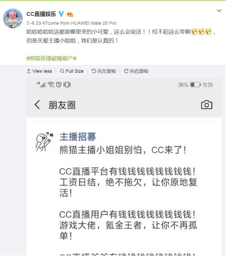 就在熊猫被传倒闭3月6号那天,网易CC直播的娱乐官微就迅速宣布欢迎熊猫的优秀主播。