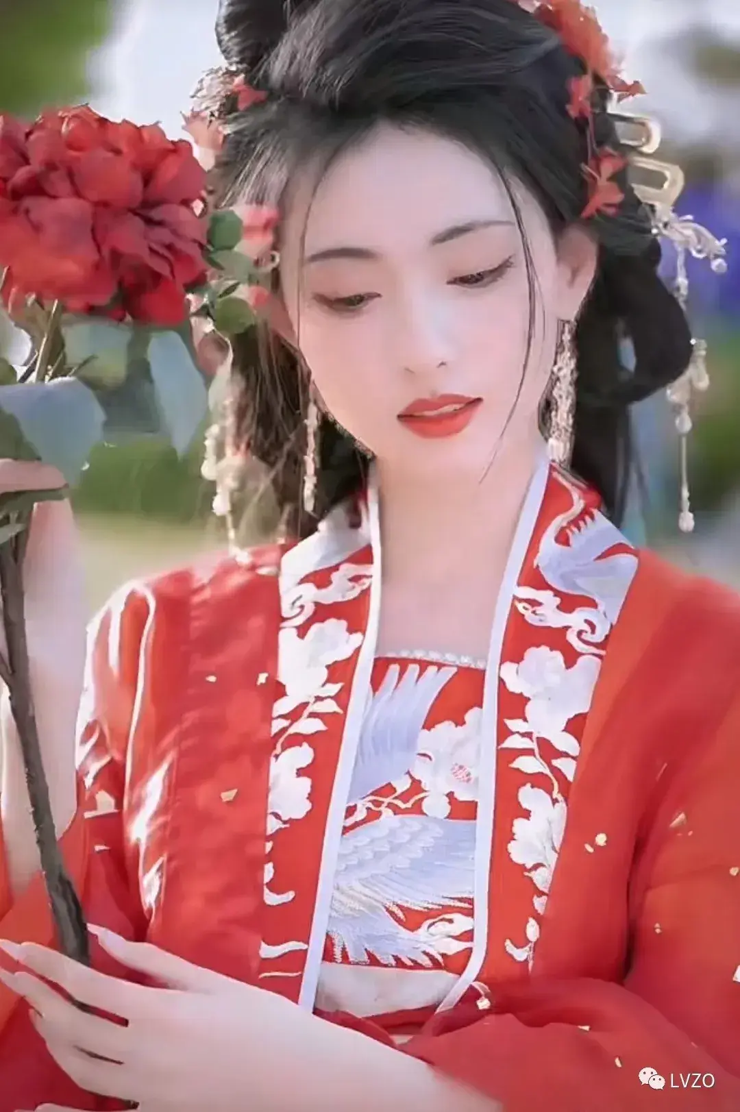 青华一身正红色带黑的广袖长裙,束腰,喜庆低调,捧着一顶富丽堂皇的凤冠,凤冠富丽堂皇,精妙绝伦。
