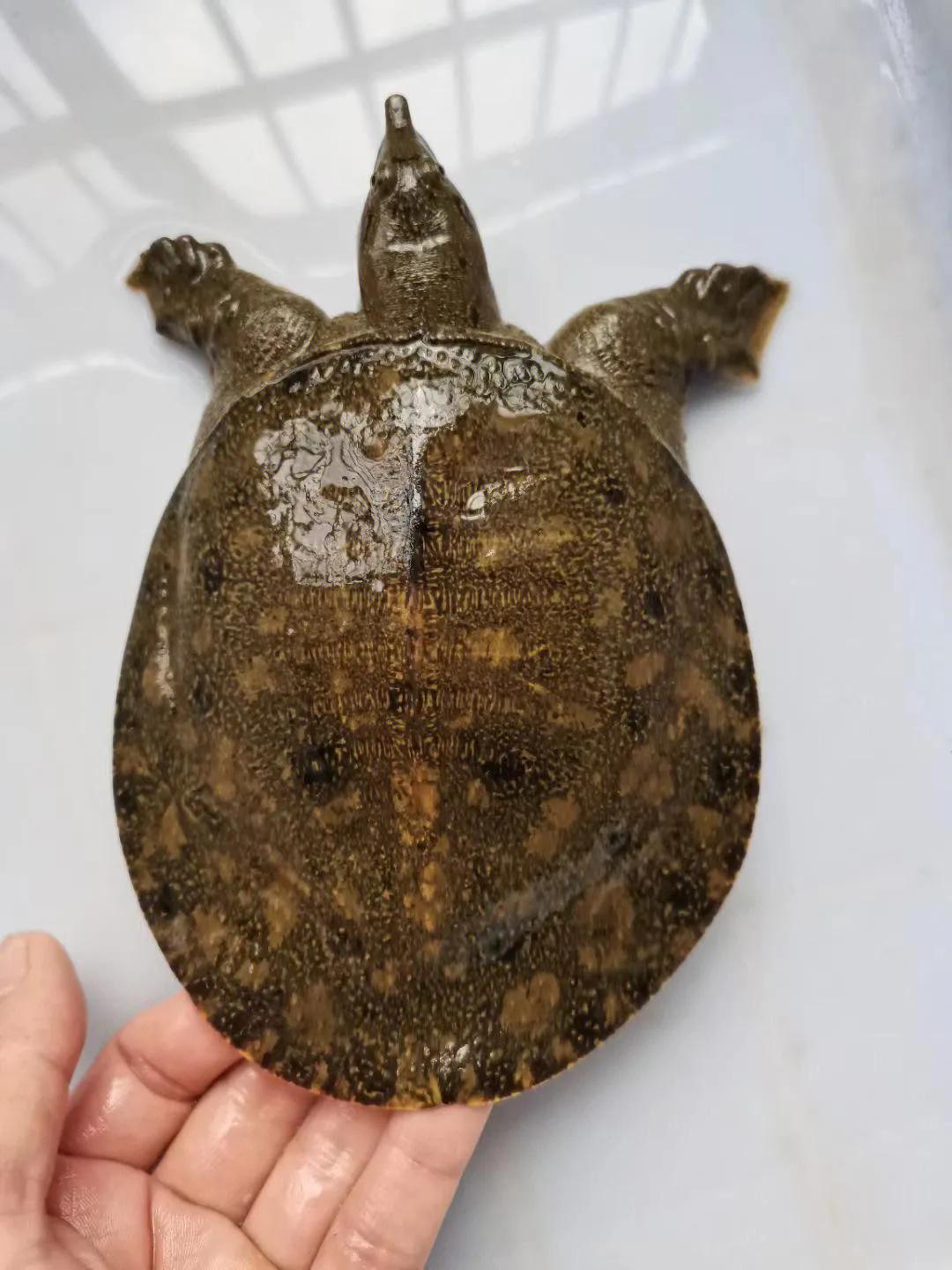 是鳖科、鳖属动物。成体背盘长192.0-345.0毫米,宽138.8-256.0毫米。头中等大,前端瘦削。吻长,形成肉质吻突,鼻孔位于吻突端。眼小,瞳孔圆形。吻突长于或等于眼间距,等于或略短于眼径。耳孔不显。背盘卵圆形,后缘圆,其上无角质盾片,而被覆柔软的革质皮肤。背盘前缘向后翻褶。盘面有小瘰粒组成的纵棱,每侧7-10余条,近脊部略与体轴平行。腹甲平坦光滑,可具7块胼胝,分别在上腹板、内腹板、舌腹板与下腹板联体及剑板上。腹甲后叶短小。四肢较扁。第五指、趾外侧缘膜发达。体背青灰色、黄橄榄色或橄榄色。腹乳白色或灰白色,有灰黑色排列规则的斑块。幼体裙边有黑色具浅色镶边的圆斑,腹部有对称的淡灰色斑点。颚与头侧有青白间杂的虫样饰纹。
