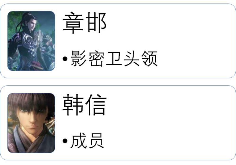 秦始皇的贴身侍卫队,正如其名,行动快速,杀伐果断,如死神般如影随形,虽然官阶不高却拥有生杀大权,直接接受嬴政的指令。目前来说,影密卫出现的成员多数是拿着锁链和短刀进行战斗的小喽啰。不过基于该组织的特性,大多数时候都是把自己隐藏起来,毕竟他们主要的任务是保护秦始皇和扶苏。
