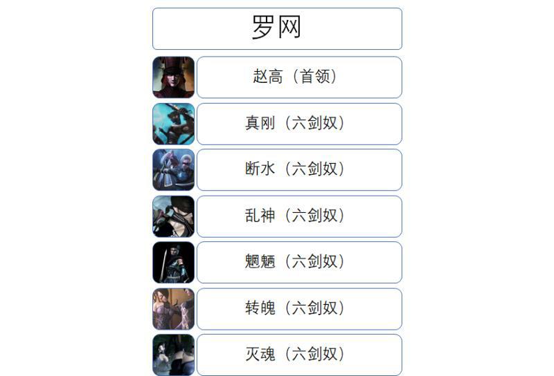 罗网作为实力中最强的存在,自然里面的等级制度也是最严格的。从高至下,依次为天、杀、地、绝、魑、魅、魍、魉。其核心杀手是六剑奴。加入罗网的人都会有一个属于自己的代号,赵高会送给他们一把利剑,那把利剑的名字就是他们的代号。