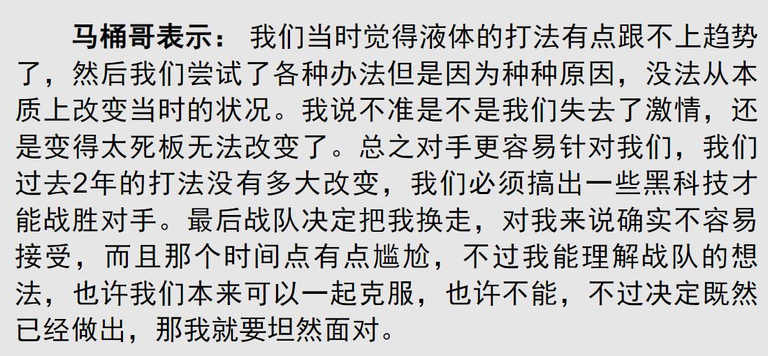 TI8 的故事不用(不想)多说,最终液体获得了第四名,也算是一个不错的成绩。TI8 结束后,冠军教练 Heen 离开了液体,TI9 之前液体实力依旧强劲,可除了年初的 MDL,液体始终与冠军失之交臂,到了 TI 那个版本,他们始终找不到合适的打法,整个团队无法忍受这种现状,在ESL 伯明翰液体只获得第八名的成绩后,马桶哥 “被离队”,中单换成了米波绝活哥 W33。