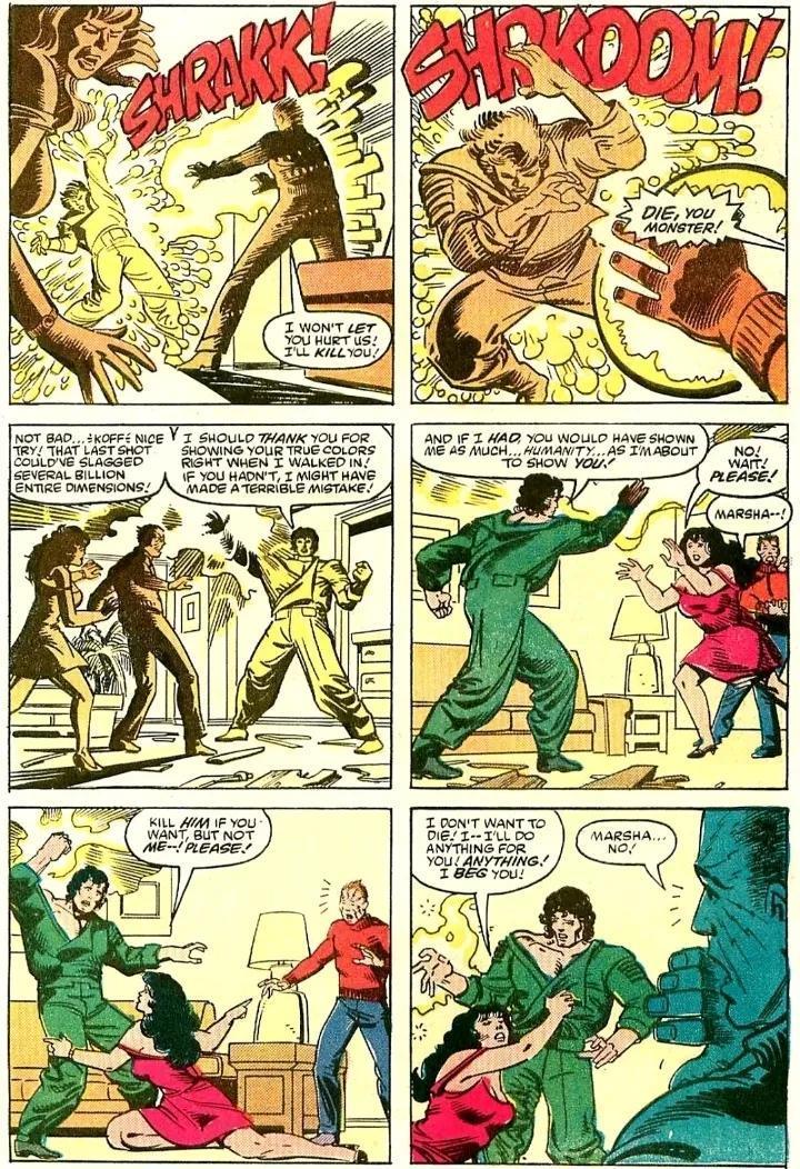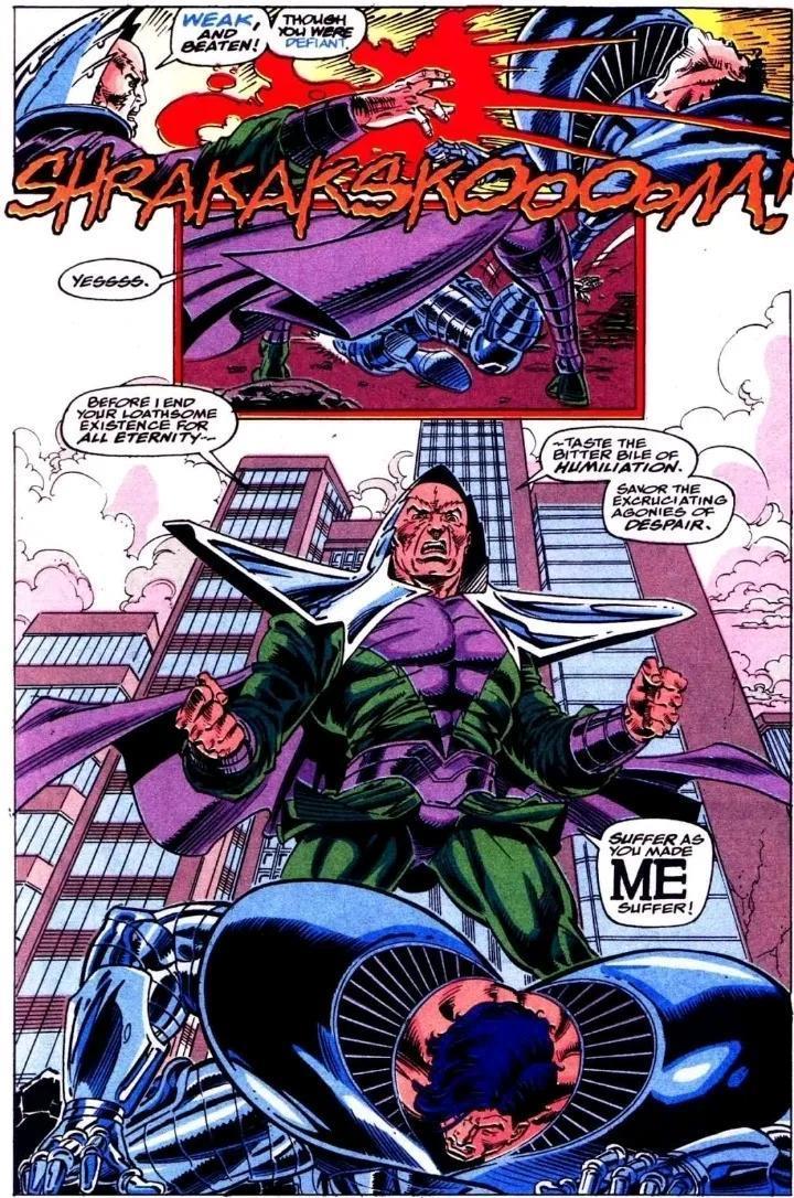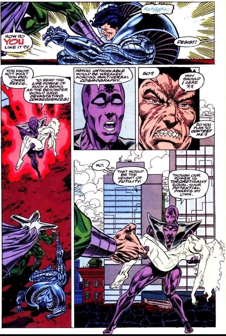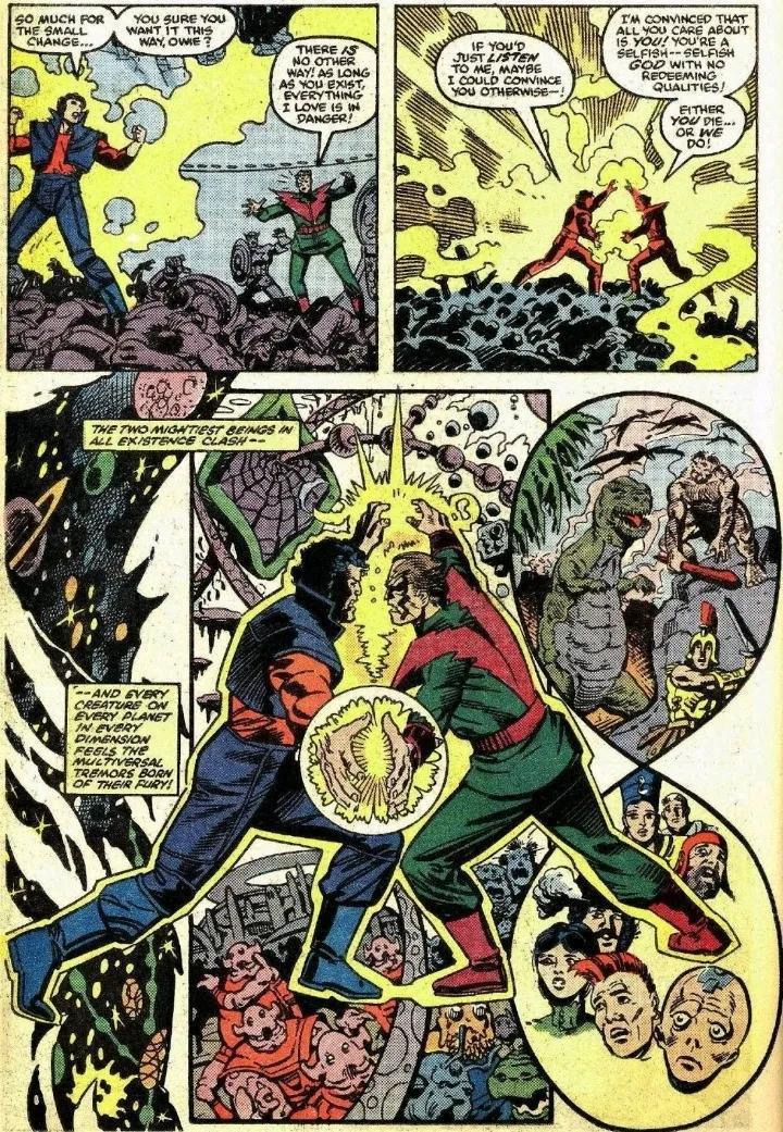 两人的战斗跨越时间和空间,从量子领域到多元现实皆被这股力量撼动。引发各种宇宙异象,使雕像流血泪、盆栽获得超人智慧、使观察者失明…