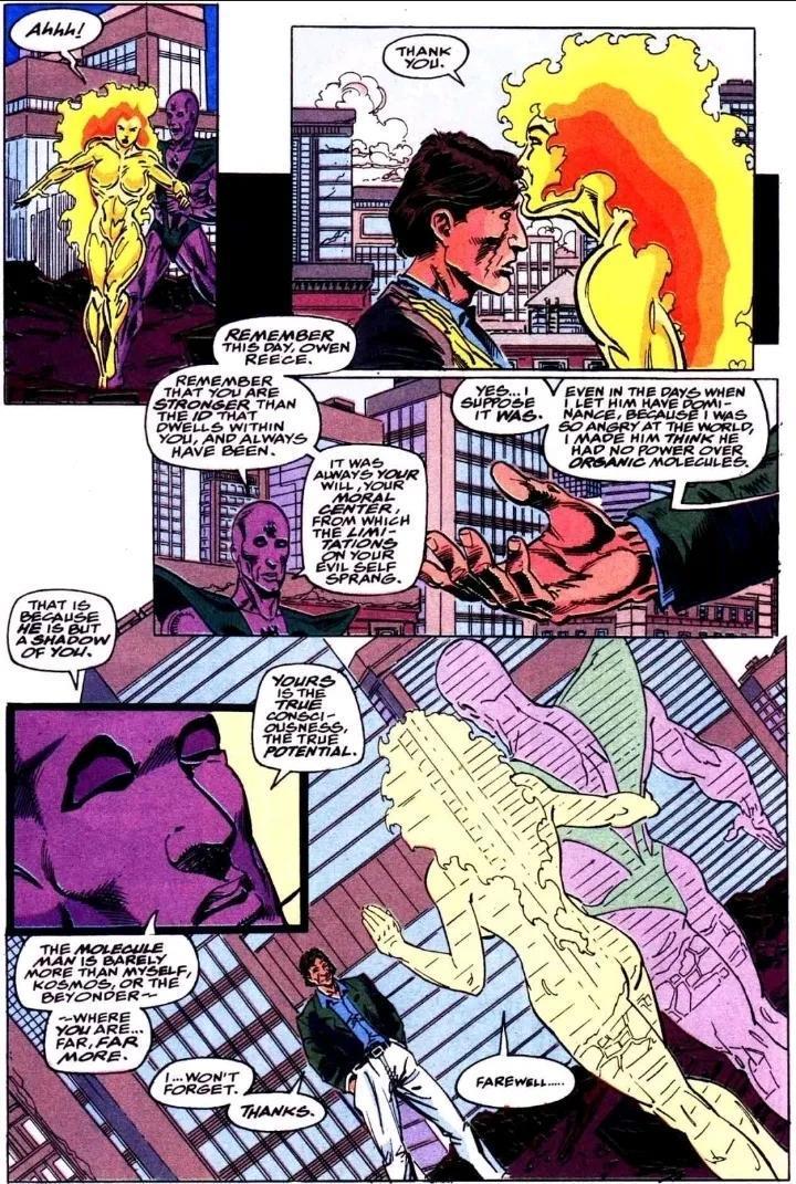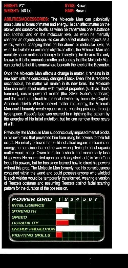 一旦分子人改变了物质,就会保持新的形态,直到他有意识地把它变回来。即使他失去知觉,事情仍将以新的形式存在。分子人甚至可以影响具有神秘属性的物质(如雷神之锤)、宇宙动力物质(银色滑行者的冲浪板)和人类设计的最坚不可摧的材料(美国队长的盾牌)。能够将物质转化为能量,分子人以前可以创造空间扭曲,使穿越超空间成为可能。欧文的脸上有一道闪电般的疤痕这是他最初突变的能量造成的,但他可以随意去除这些疤痕。