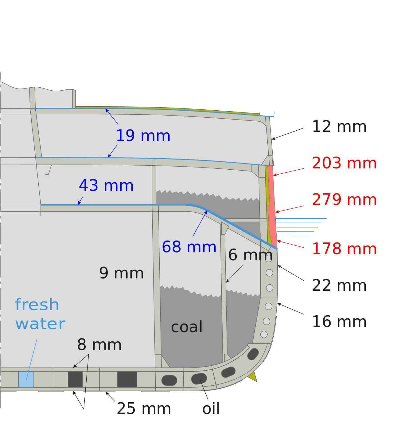 水线装甲为4—11英寸(102—279毫米)。