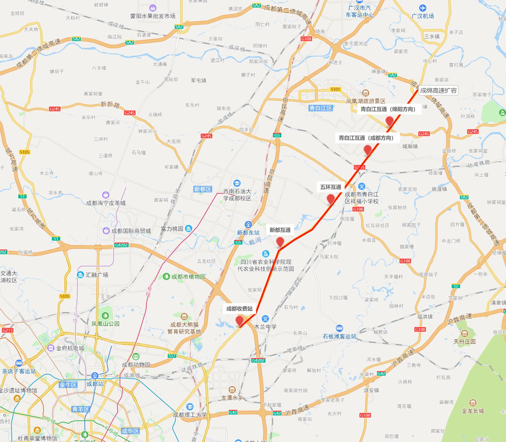 成绵第二复线成都段采用全高架形式,双向八车道设计,建成后青白江区最快15分钟飙拢成都。项目计划工期约3年,于2020年12月开工,预计2023年建成,该项目属省管高速,由蜀道集团建设运营。