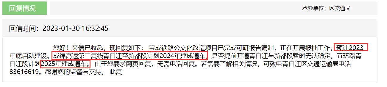 同时青白江区一直致力积极争取将已规划相关市域铁路线纳入该规划。为补齐青白江区轨道交通建设短板,由市级部门牵头,研究利用宝成铁路富余运力实施宝成铁路公交化改造,实现青白江区与成都中心城区的快速联系需求。