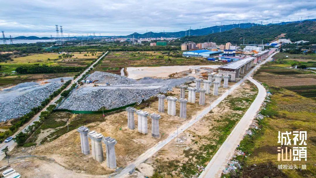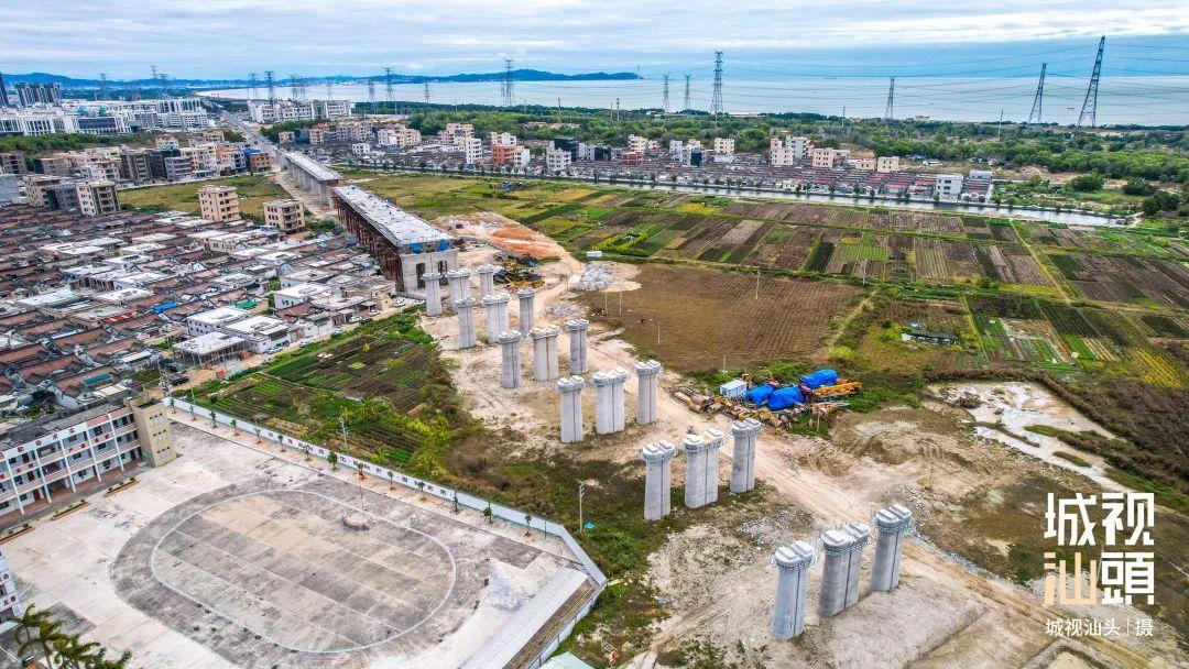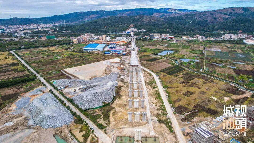时速 350 公里的广州至汕头高铁(潮南段)正线长度 15.54 公里,共有桥梁 3 座。目前,潮南段所有铁路桥墩均已完工,架梁施工全面铺开,预计今年 6 月底完成。