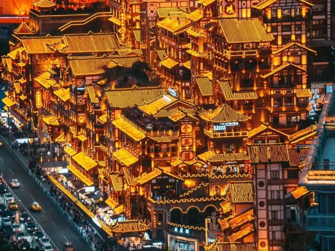 56.重庆洪崖洞夜景,位于重庆市渝中区境内,是一个独特的悬空于崖壁上的古镇。夜晚时分,整个古镇灯火通明,崖壁上则是五光十色的霓虹灯,与江水交相辉映,美不胜收。