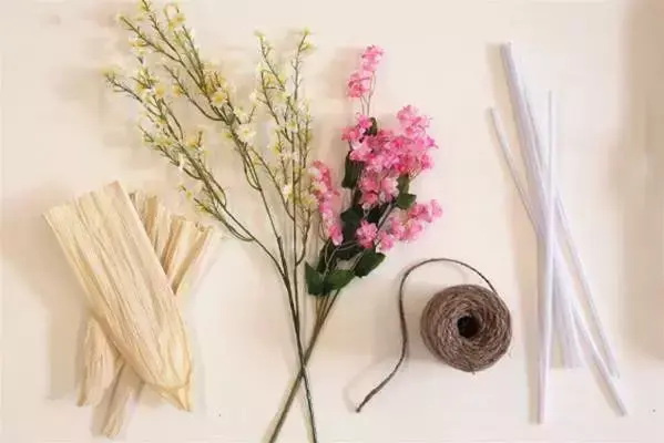 准备材料:干的玉米皮、吸管、麻绳或细绳、小朵的假花、剪刀、热熔枪