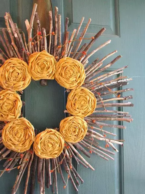 或者可以选择用玉米皮做成玫瑰花,小树枝打底,点缀小红果装饰,这样的门环带着浓浓丰收的喜悦感。