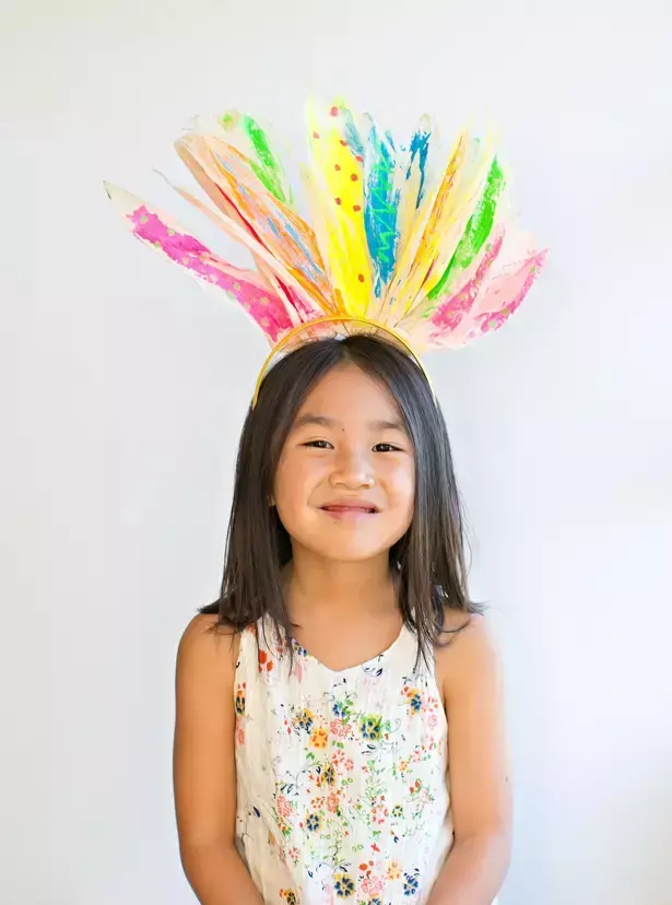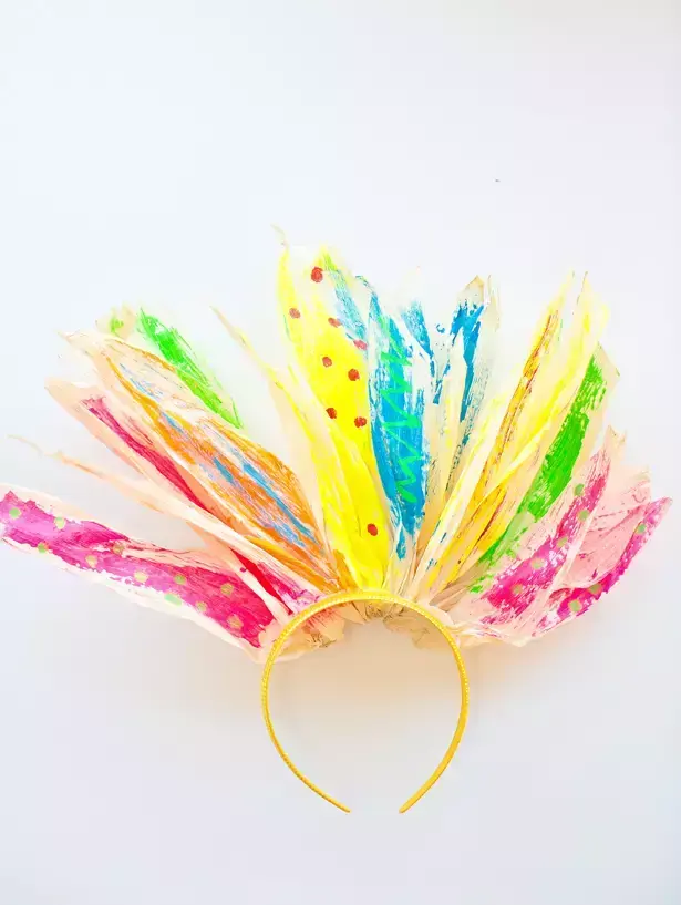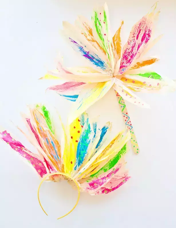 接下里,我们再来制作发卡/发带。同样的方法,先将玉米叶粘成一朵小花的形状,然后让孩子自由发挥想象力,用颜料来点缀。最后,热熔胶枪上场,将玉米叶做成的花朵黏在发卡或者发带上面即可。