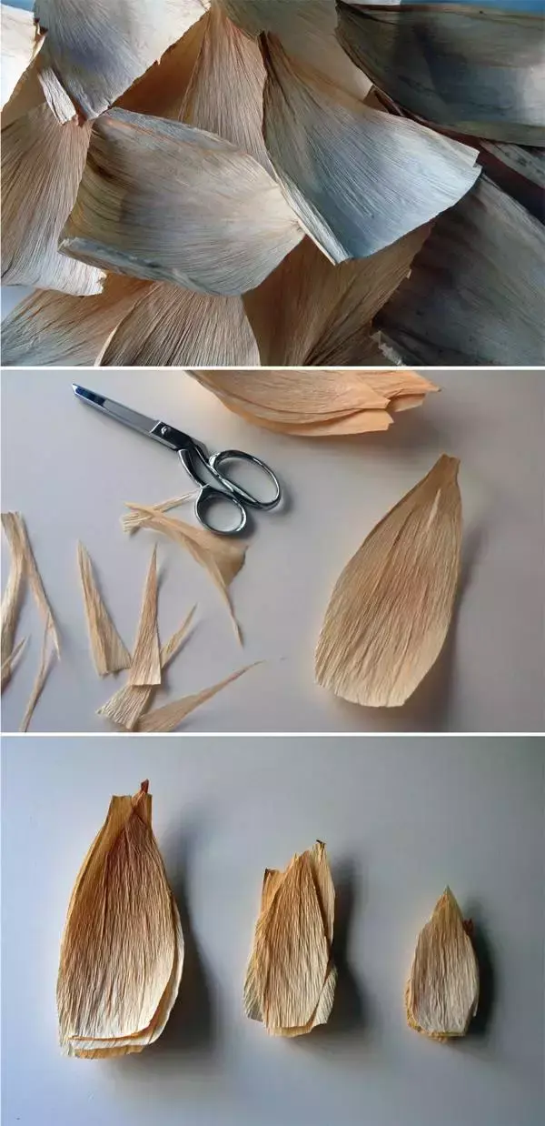 首先,准备好玉米皮和剪刀,并将玉米皮裁剪成三种不同大小的形状,分类摆放在一起。