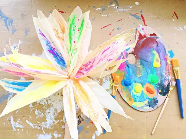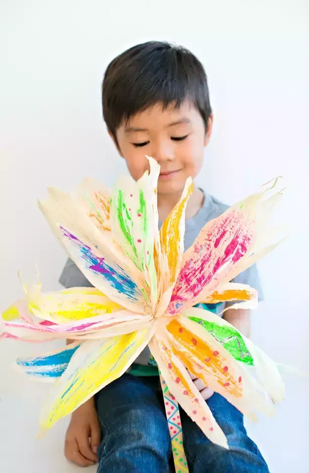 制作步骤:首先,你需要帮助孩子用热熔胶枪将干的玉米叶粘在一起形成花朵的形状,然后鼓励孩子拿起颜料刷,随意涂刷吧!涂完后,只需将其粘在冰棒棍上即可!漂亮的玉米叶花就诞生了!