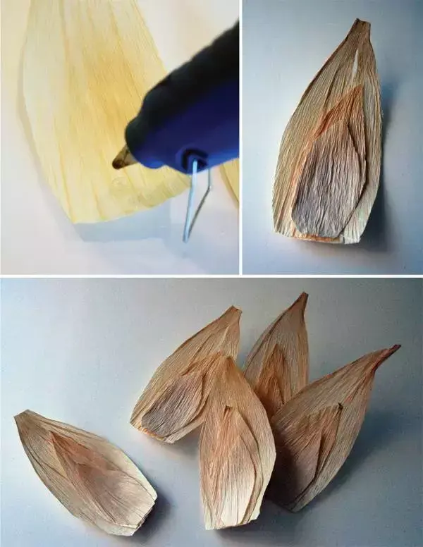 然后,按照小中大的顺序,组合好每一片花瓣,并用胶水黏贴固定好。
