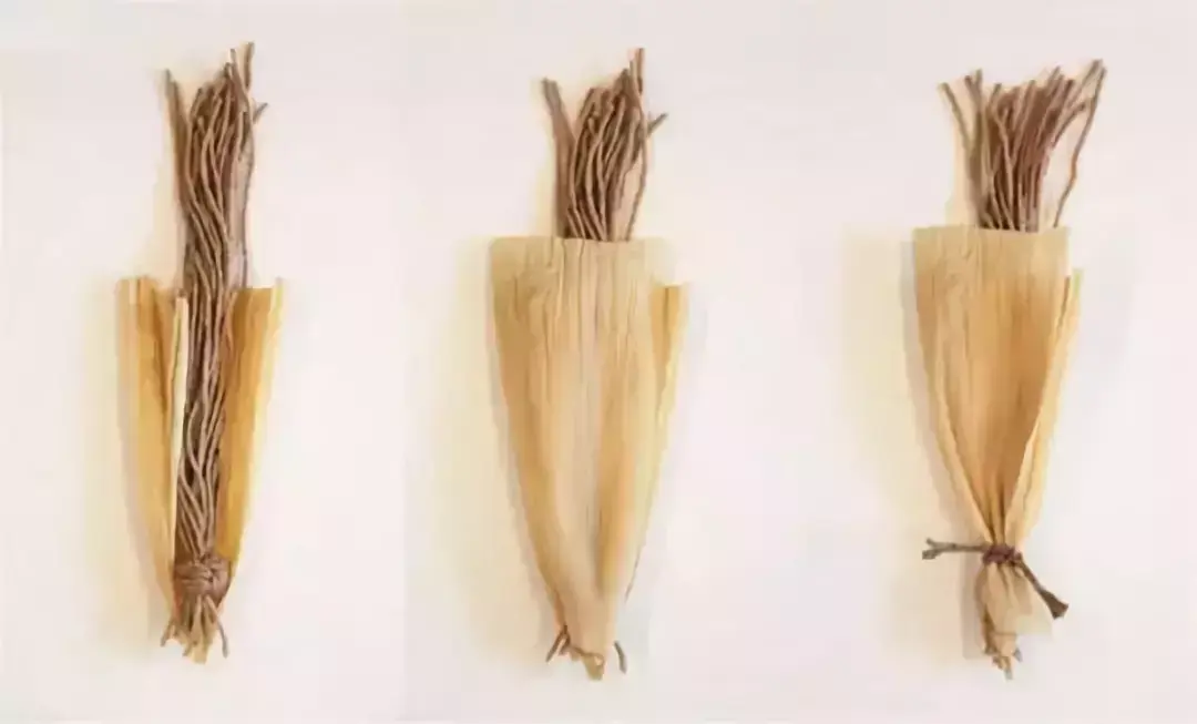 制作步骤:首先,把干的玉米皮放温水里浸泡十分钟,这样玉米皮会变软,容易操作,泡好后用纸或布什么的把水分吸干就可以了。