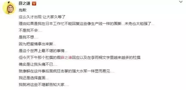 而薛之谦则是一点点的掉入圈套,他天真的以为用自己的省略号体,就可以轻易撬动所有粉丝的立场,进而掌控舆论,并在巩固自己完美人设的基础上,完成对于李雨桐的毁灭。