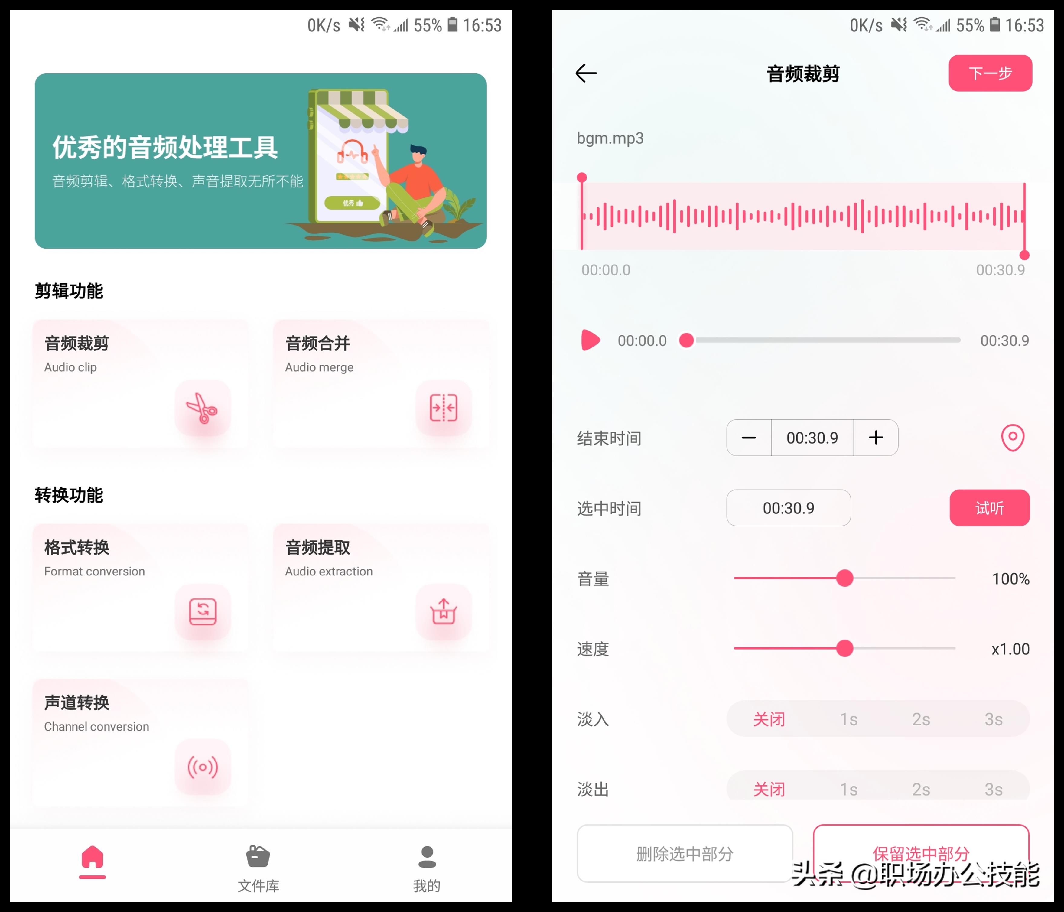 视频配音需要剪辑音频,手机上配备这款音频处理工具,真是太方便了。音频裁剪、合并、转换,样样精通!还能设置音频的音量大小、播放速度,以及淡出淡入的时间。