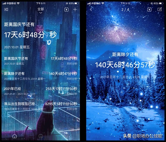 这是一款时间管理工具,我们可以添加一些纪念日或者倒计时,还能设置提醒,时间精确到每一分每一秒,这上面的背景非常好看,尤其是动态壁纸自带BGM,颜值挺高的。