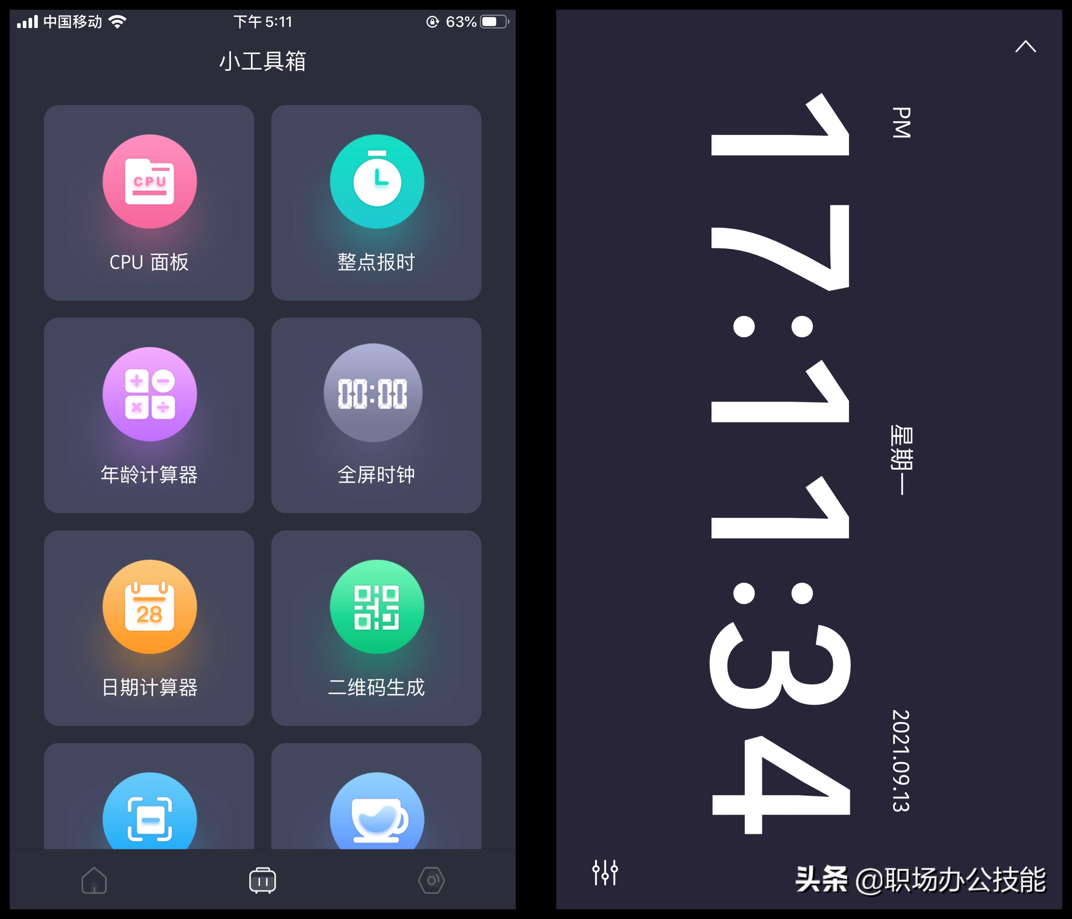 其实我更倾向于它的小工具箱,可以在桌面添加CPU面板挂件,还有整点报时功能,全屏时钟我的最爱,将手机横过来,整个屏幕显示滚动时间,工作学习时,看时间非常不错。