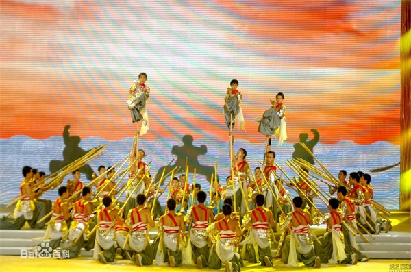 一指禅、二指禅+5名少年演员在2、4 米高的道具上90度倾斜,有一人臀部站立一名儿童,倾斜度比倾斜之王杰克逊的45度高出一倍+5名大孩站在2、4米高的木桩上,5名儿童站上他们头顶,表演朝天蹬、挂脖。