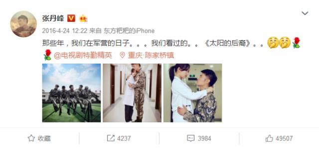 结果,演员张丹峰在微博上曝光了几张顶着中国版《太阳的后裔》头衔的电视剧#特勤精英# 剧照,就让迷妹们期待值飙升。
