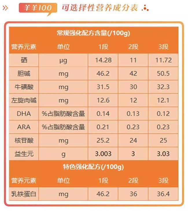 在营养与配方上,羊羊100羊奶粉添加的基础营养配方严格遵守国家标准,小编在此就不多说,我们具体谈谈大家比较关心的可选择成分。羊羊100羊奶粉全段添加9个可选择成分,包括8个常规强化配方和1个特色强化配方。