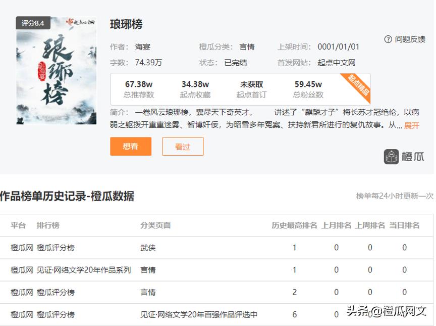 在橙瓜武侠和言情评分榜上,《琅琊榜》的历史最高排名分别为第一和第二。