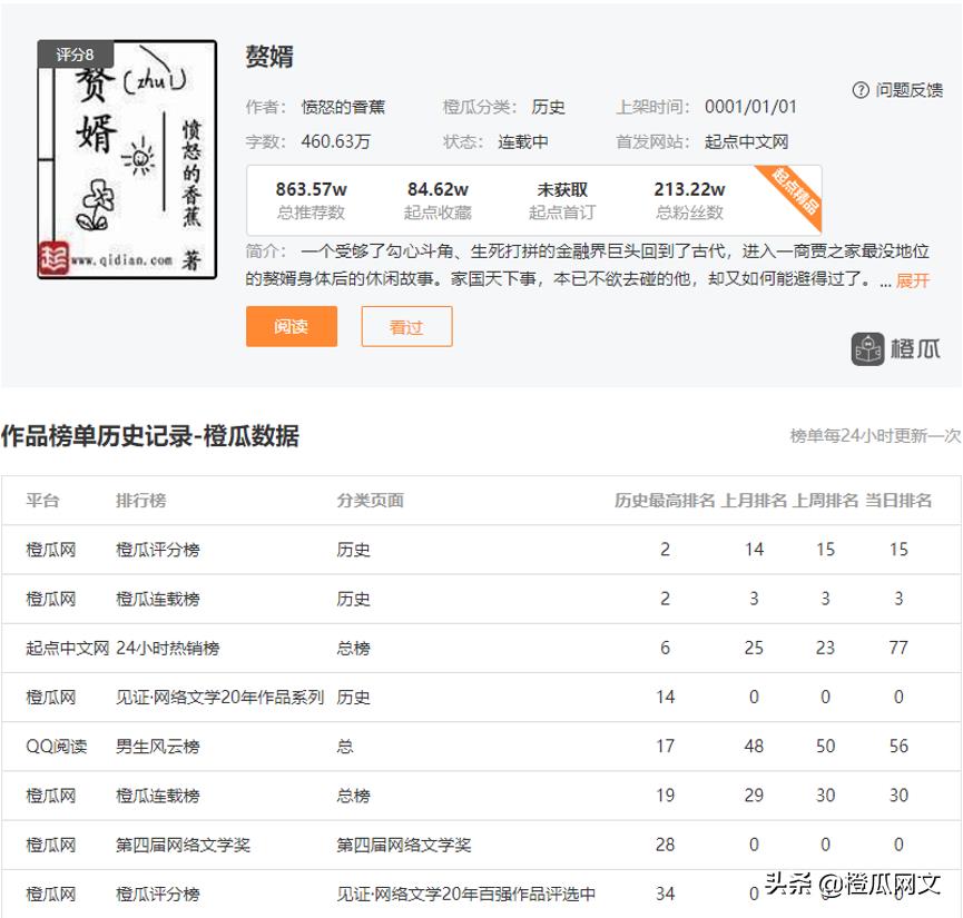 《赘婿》是愤怒的香蕉所著小说,于2011年首发于起点中文网,目前仍在连载中。截至目前,作品获得了863.57万推荐、84.62收藏和213.22万粉丝。其在橙瓜数据上的成绩也十分优秀,高于许多作品。