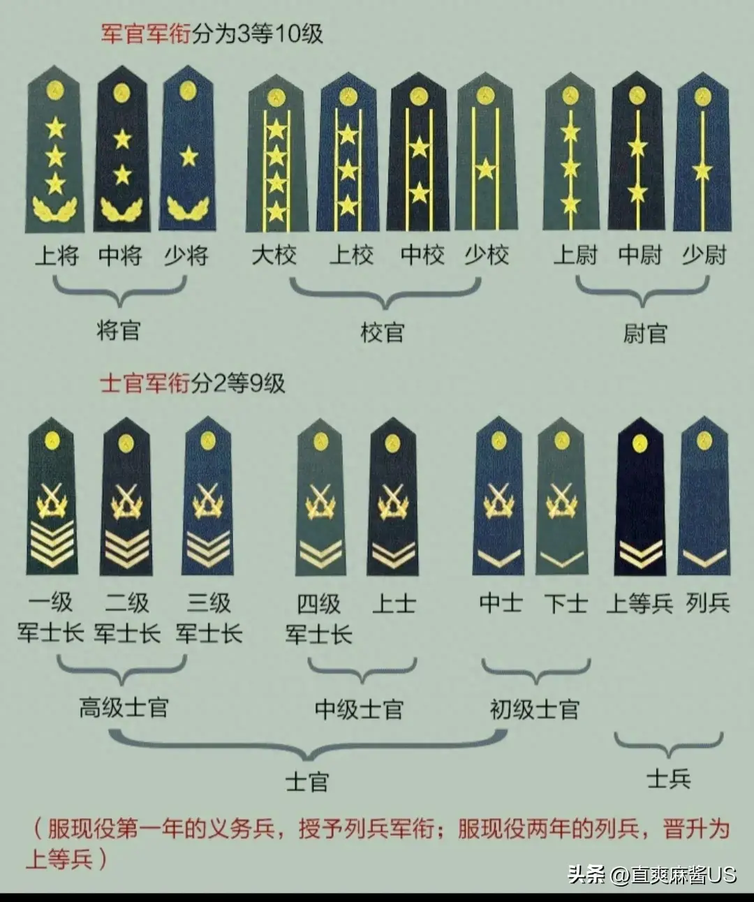 现如今在我军,军官军衔分为尉官、校官和将官三等十级。通常,一名士兵想要成为军官必须经历军事院校培训,受过军事指挥系统教育,然后通过各级军衔的晋升逐步提升自己的职务和地位。