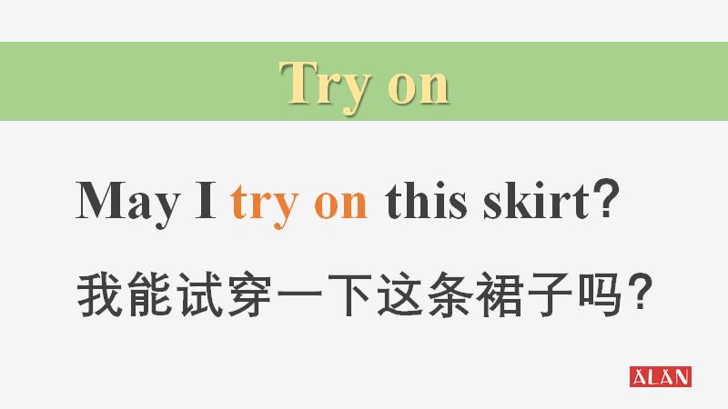 首先我们来学习一下try on这个固定搭配,它的意思是“试穿”,使用的场景大多是在买服装店或者鞋店里,顾客在购买前,会进行试穿,来确保衣服在版型还有尺寸风格上是适合自己的,所以这个词常用度非常高!比如你想试穿一下短裙,可以用英语这么和服务员说: