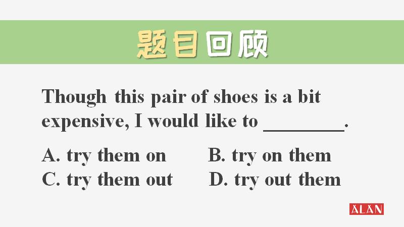 根据我们上面所说的,当宾语是一个代词的时候,一定要在谓语和副词的中间,所以选项B和D出局,再来考虑一下try on 和try out的区别,试穿我们使用的是try on,所以正确答案是选项A!你答对了吗?