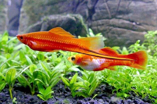 剑尾鱼剑鱼6~8月龄性成熟,雌雄鱼很容易识别,雌鱼除无剑尾外较雄体略为肥大;雄鱼各鳍较尖,臀鳍前部分鳍条演化成输精器。成熟亲鱼在适温时期,每隔4~5周繁殖一次,每次产仔鱼20~30尾,多的近百尾,适宜繁殖的水质硬度6~9度、pH7~7.2。