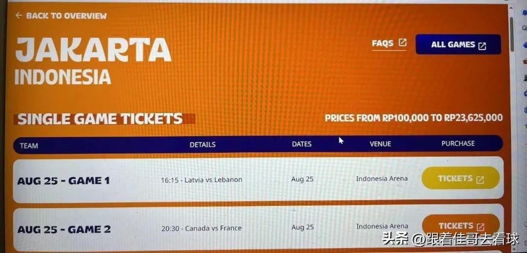 印尼赛区:目前仅可购买单场票,票价100000到23625000印尼卢比不等(约合人民币48-11306元)。