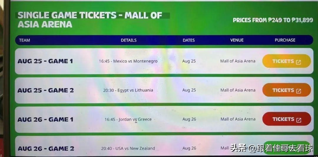 亚洲购物中心体育馆单场票价249-31899菲律宾比索(约合人民币33-4192元)不等,其中美国队第一阶段小组赛对希腊的票价为699/3849/7699/14599/19199/27299菲律宾比索,另外两场小组赛票价为499/2399/4799/8299/10599/14599菲律宾比索。决赛票价为5549/11099/18099/22699/31899菲律宾比索,半决赛票价为4399/8799/15799/20399/28499菲律宾比索。
