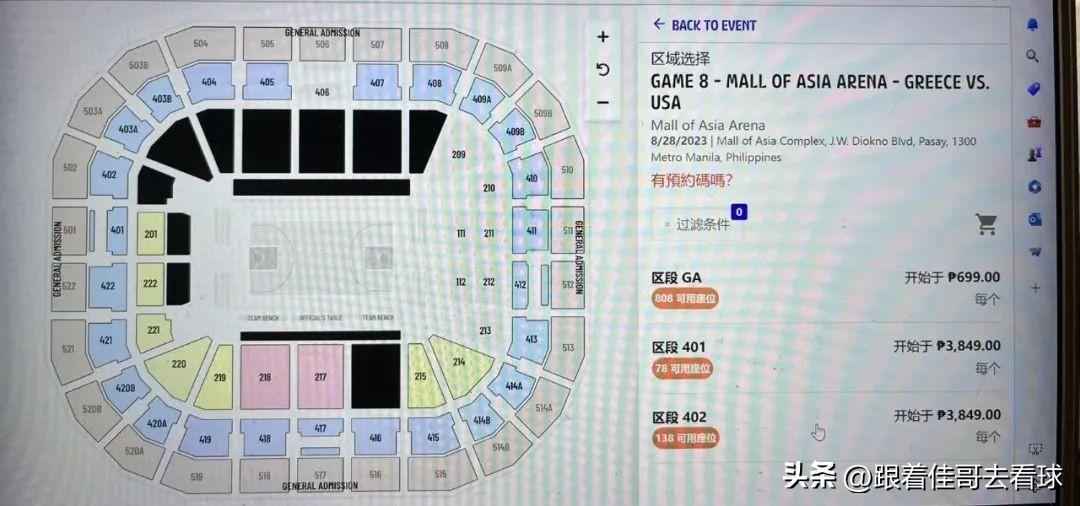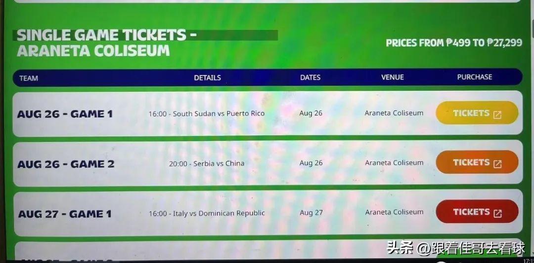 菲律宾赛区:目前可购买的为揭幕战单日通票和单场票。8月25日揭幕战单日通票(含安哥拉VS意大利和多米尼加VS菲律宾两场比赛)票价为999-23699菲律宾比索(约合人民币131-3114元)不等。阿拉内塔体育馆单场票价499-27299菲律宾比索(约合人民币66-3587元)不等,其中中国队第一阶段小组赛第一场对塞尔维亚的票价为699/3849/7699/14599/19199/27299菲律宾比索,后两场小组赛的票价为499/2399/4799/8299/10599/14599菲律宾比索。