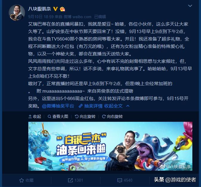 根据油条在个人微博中透露的消息,在9月13日复播的第一天时,他将在直播期间不断抽取礼物赠送给水友,其中包括了万元现金等豪华大奖放松。看起来,油条为了这次的复播也是做好准备,为广大观众准备了数万元的精美礼品,送到粉丝们手到软。