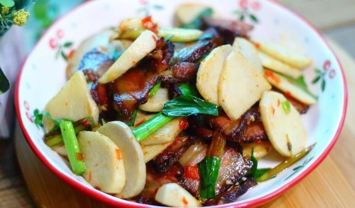 做法:冬粉薯切厚片备用,腊肉切片备用;将腊肉煸炒出油,加冬粉薯、加水焖十分钟,后加入调味料爆炒收汁即可。